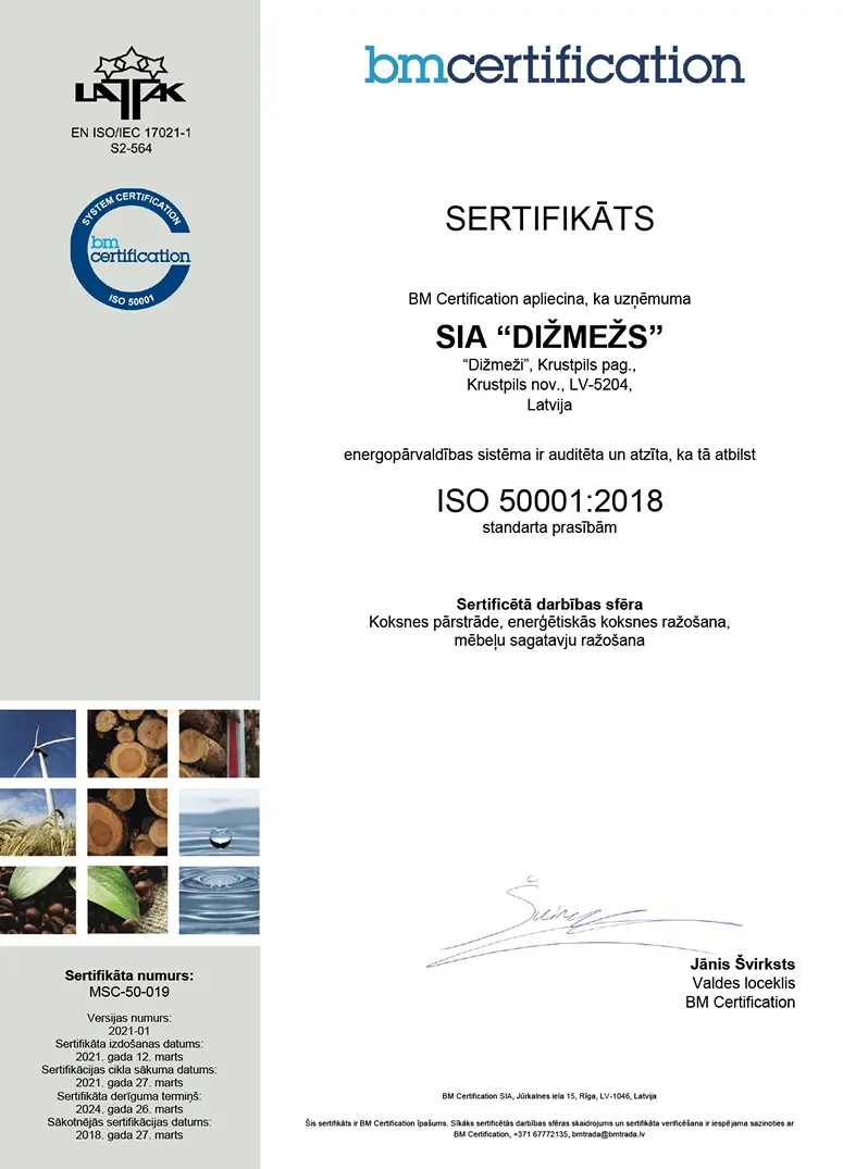 Dižmežs kokapstrādes nozarē darbojas jau gandrīz 30 gadus, attīstot ražošanu un piegādes kapacitāti atbilstoši starptautisko tirgu prasībām. Uzņēmums gadā saražo vairāk nekā 88 000 m³ cietā kurināmā, nodrošinot stabilu piegāžu apjomu un vienmērīgu produkcijas kvalitāti.